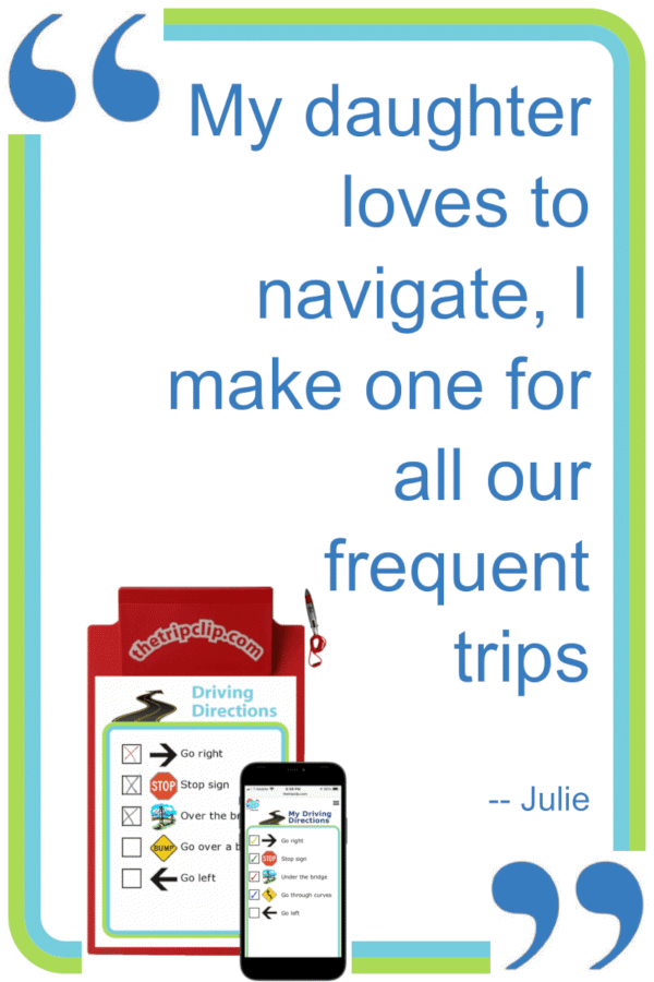 The Trip Clip® offers products for parents and teachers who are raising and educating kids. You'll find printable and mobile picture checklists, learning games, and ideas to help you on your trip through life with kids! Whether you’re on a road trip or just running errands around town, this picture list can help entertain your kids and make the time go faster. Let your kids direct the car! It can also give them milestones to mark off along the way so they know how much longer it will be. Using this will help kids learn right and left, keep them looking out the window instead of buried in a screen, help them learn the layout of their neighborhood and recognize frequent landmarks, and start to recognize and understand road signs. For older kids, you can use the compass images to help them learn north/south/east/west. You can also give them the directions one way and then ask them to figure out how to direct you home by working backwards. Learn More